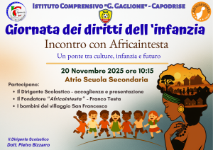 Manifestazione finalizzata a promuovere riflessioni, approfondimenti e momenti di confronto su temi essenziali per la crescita consapevole dei nostri studenti, con la partecipazione dell’Associazione Onlus “Africaintesta”.