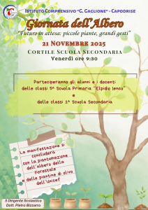In occasione della “Giornata Nazionale degli Alberi 2025”, nel cortile della Scuola Secondaria di primo grado si svolgerà la manifestazione “Futuro in attesa: piccole piante, grandi gesti”, al termine della quale è prevista la piantumazione dell’Albero di Falcone donato dal Raggruppamento Carabinieri Biodiversità e delle piantine di olivo dell’UNICEF .