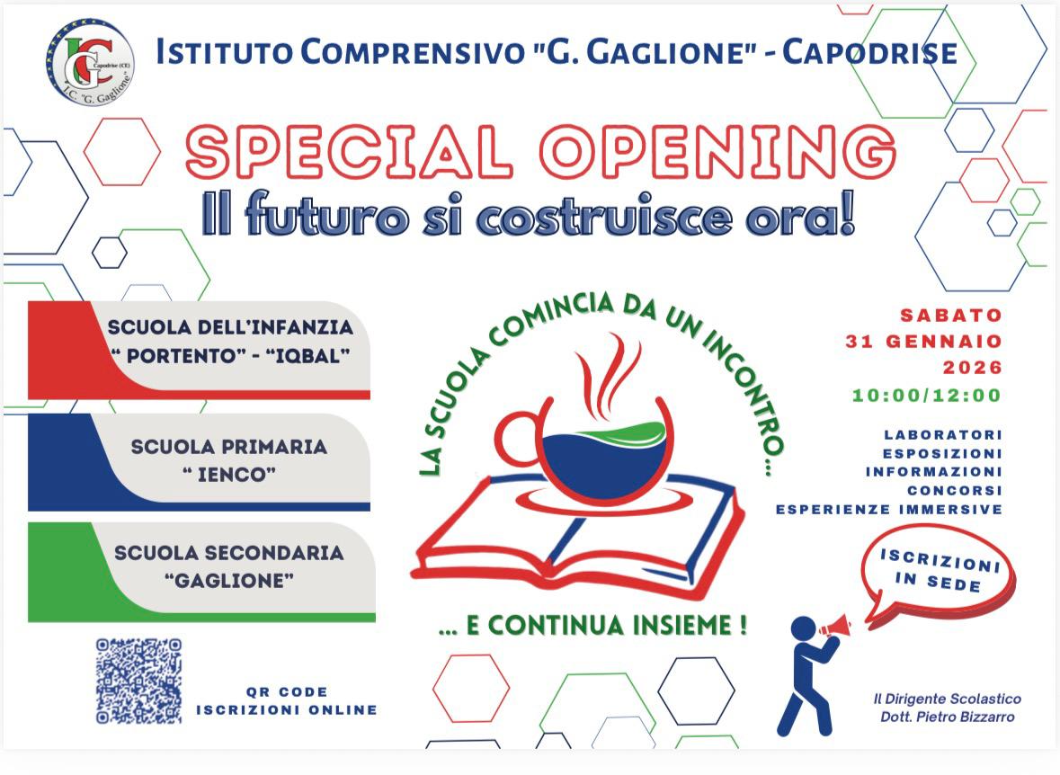 Nella convinzione che il percorso di continuità trovi forza e significato nella collaborazione e nel dialogo tra tutte le componenti della Scuola, sabato 31 Gennaio 2026, presso i plessi della Scuola dell’Infanzia “Iqbal Masih” e “Don Paolo Portento”, della Scuola Primaria “Elpidio Ienco” e della Scuola Secondaria di I grado “Giacomo Gaglione”, si è tenuto un incontro con le famiglie dei futuri alunni delle sezioni/classi iniziali, occasione di conoscenza diretta e di condivisione di informazioni, domande, aspettative e riflessioni legate all’inserimento scolastico/al passaggio al segmento di scuola successivo.